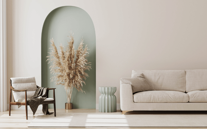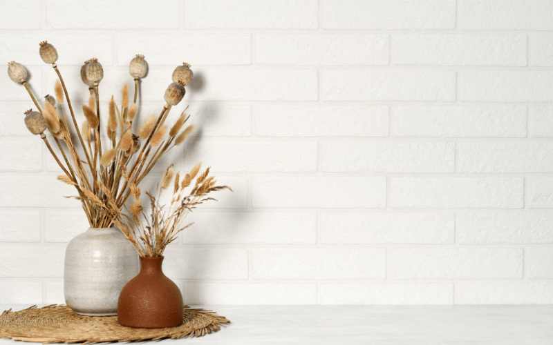 Ein runder oder rustikaler Holzrahmen mit Pampasgras, Trockenblumen und Erdtönen (Terrakotta, Moosgrün) schafft eine kreative, entspannte Atmosphäre. Ideal für eine Galerie-Wand in Hamburg oder Köln.