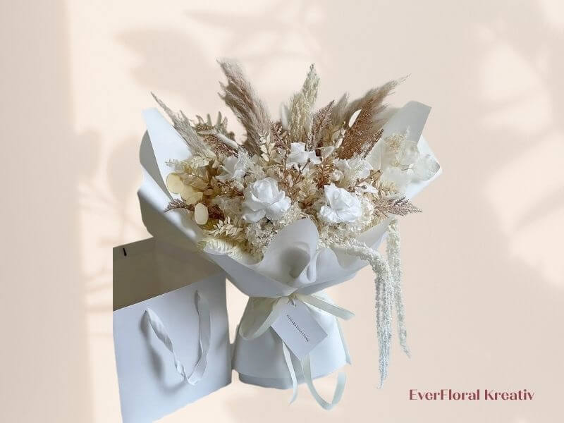 Ein kompakter Strauß mit weißen Rosen, Pampasgras und getrockneten Blüten im Boho-Stil. Der minimalistische Look passt perfekt zu modernen Wohnungen in Berlin oder Hamburg.