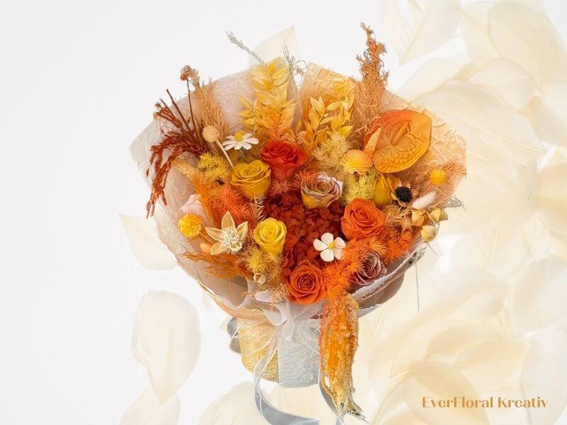 Dieser Strauß kombiniert konservierte Blumen in warmen Tönen wie Terrakotta, Senfgelb und Bordeaux. Er ist perfekt für Herbsthochzeiten oder als Geschenk in der kalten Jahreszeit.