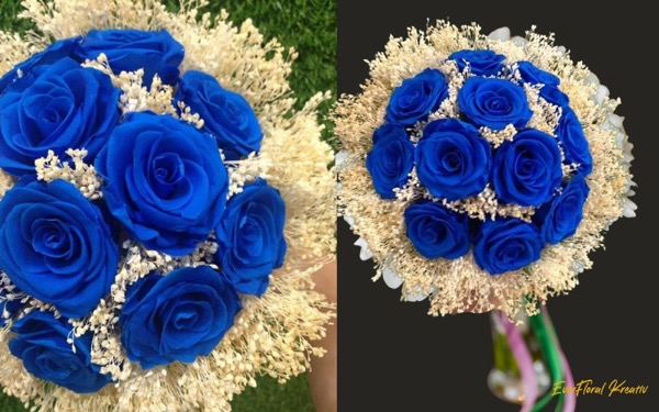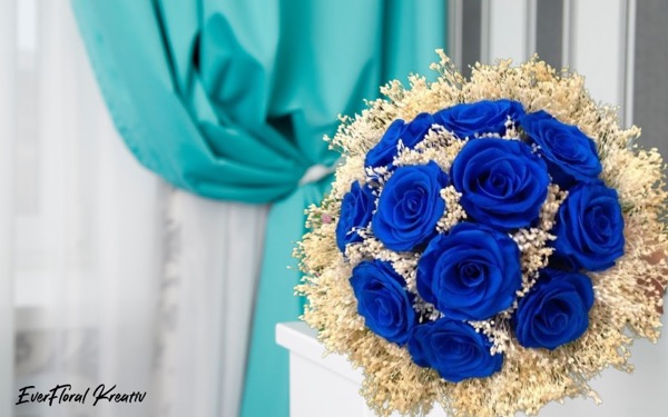 Dieser exquisite Brautstrauß verbindet die Anmut konservierter blauer Rosen mit der charmanten Leichtigkeit von Trockenblumen. Perfekt für moderne Hochzeiten, bei denen Stil und Individualität gefragt sind.