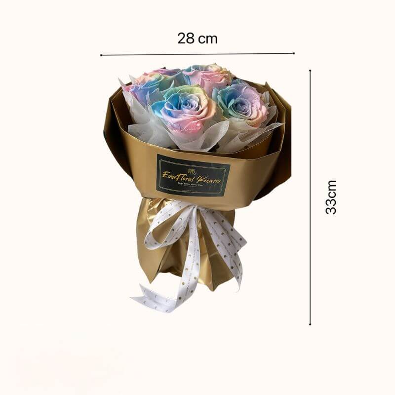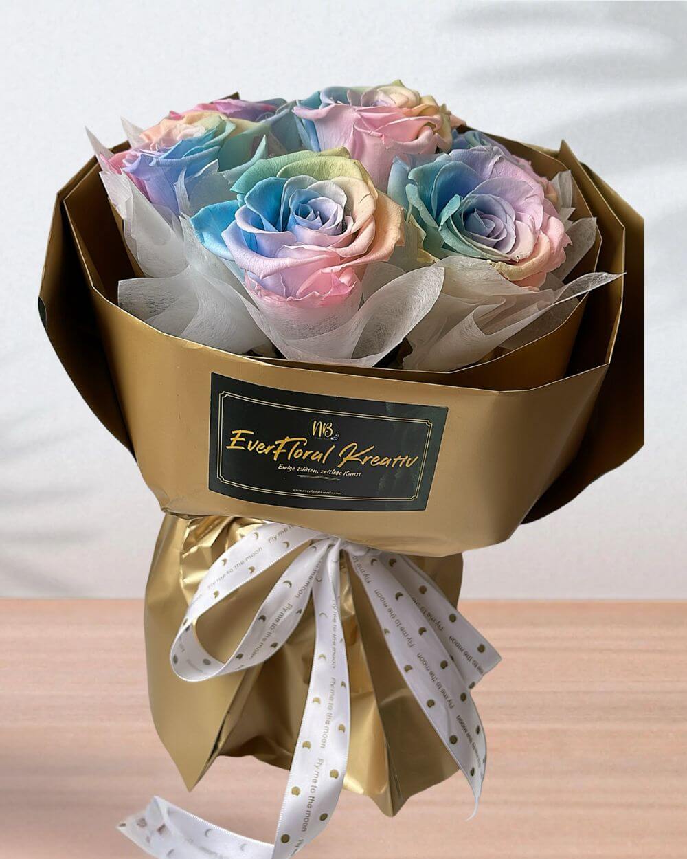 Manchmal sagt ein Strauß mehr als tausend Worte. Und manchmal flüstert er nur leise – in Farben. Dieses Bouquet aus sieben konservierten Rosen in zarten Pastell-Regenbogenfarben bringt genau diese leise Magie in dein Leben: eine Botschaft von Liebe, Hoffnung und Schönheit, die bleibt.