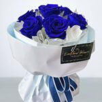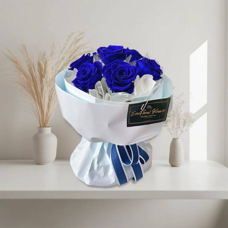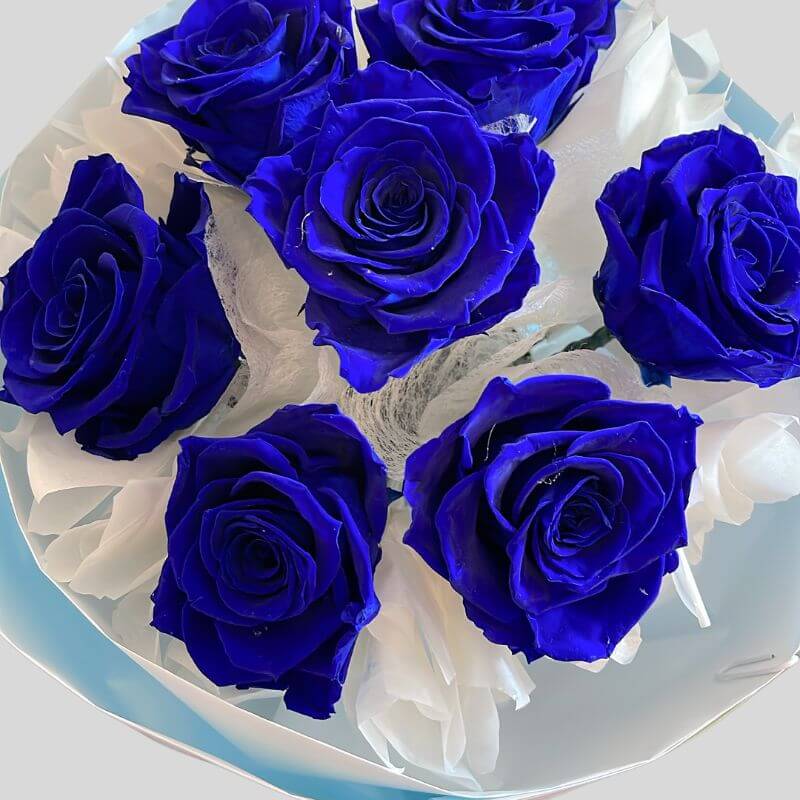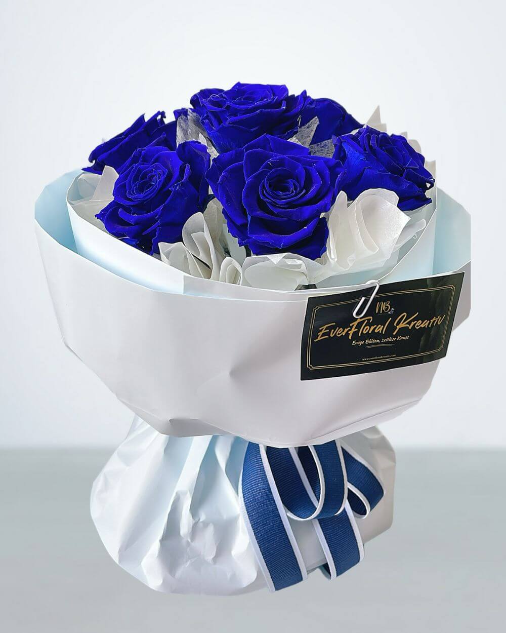 Der tiefblaue Farbton dieser Rosen steht für das Unbekannte, für Hoffnung und Harmonie – perfekt für besondere Anlässe oder als ausdrucksstarke Dekoration. Jede der 7 Rosen in diesem Bouquet wird von weißen Akzenten umgeben, was den Kontrast und die Eleganz noch mehr hervorhebt. Das hochwertige weiße Geschenkpapier mit dunkelblauer Schleife unterstreicht die königliche Aura des Bouquets.